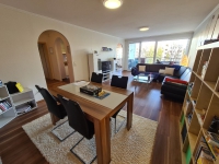 Aufteilung: Von der Diele aus geradeaus befindet sich die große Küche (eine Einbauküche mit Küchengeräten ist vorhanden) und Essplatz. Rechts daneben befindet sich das große Wohnzimmer, ebenfalls mit Essplatz und mit Zugang zum Balkon und links das moderne Gäste-Bad mit Dusche/WC.